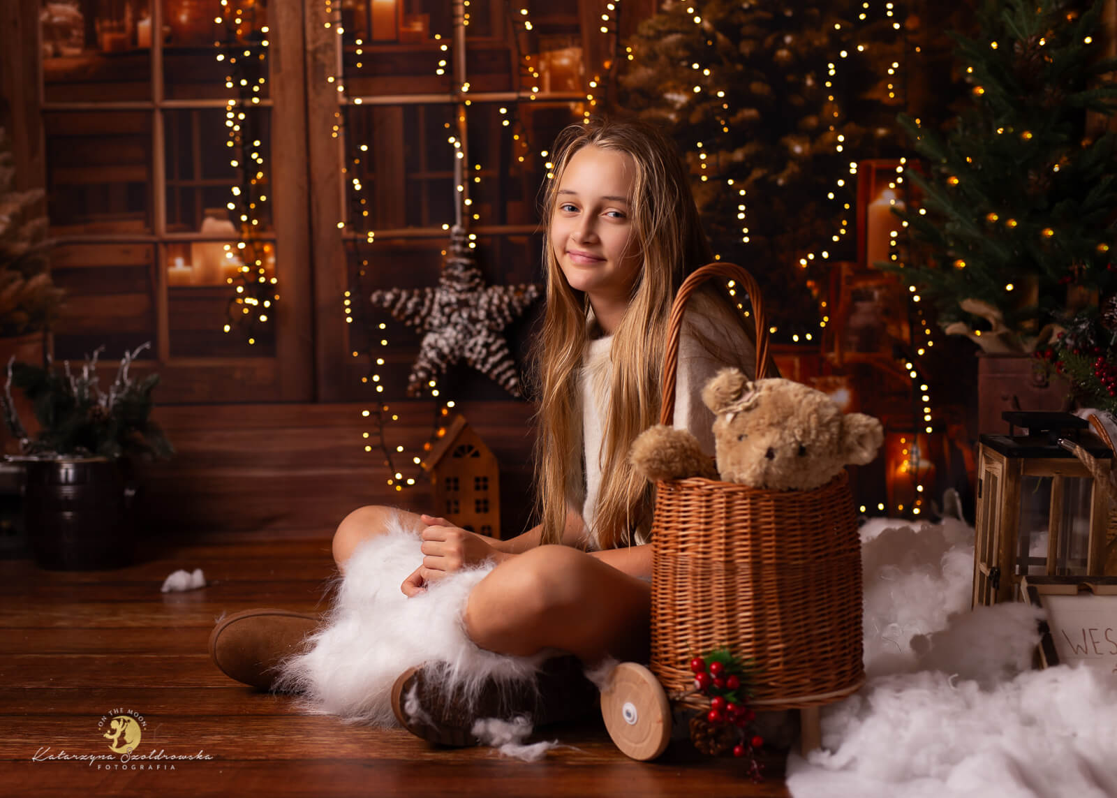 sesja świateczna krakó 2025.Zdjecie dziewczynki z sesji światecznej 2025 w studio On The Moon w Krakowie, Zdjecie na ciemno brązowej scence ze światelkami
